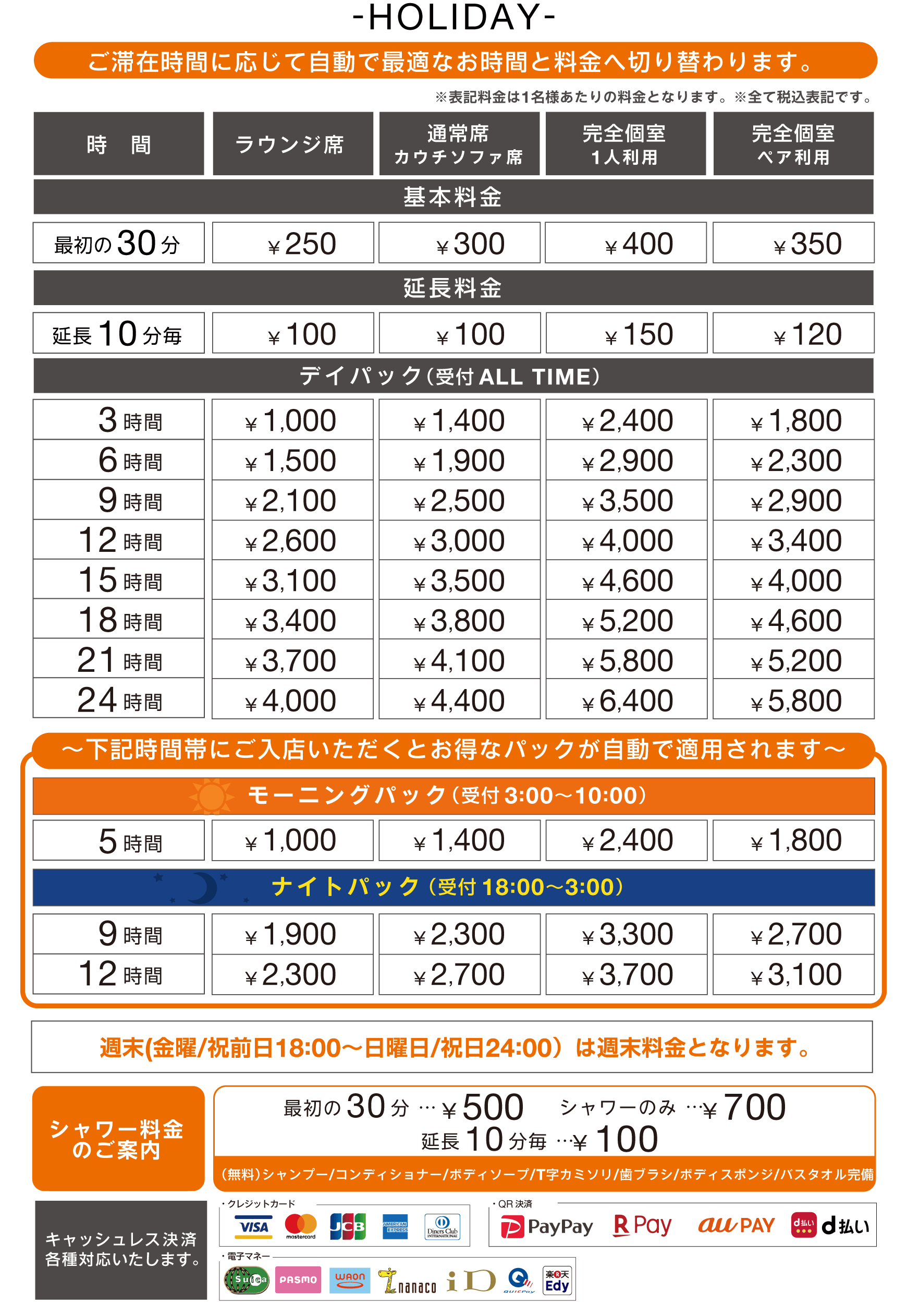 最初の30分間は500円(シャワーのみの場合は700円)でご利用いただけます。。