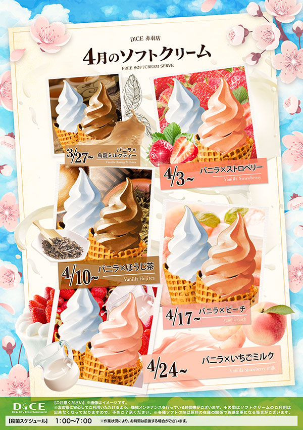 ソフトクリームスケジュール 各店のスケジュールはこちら 札幌駅南口店 札幌狸小路本店 仙台店 大宮店 池袋北口店 池袋西口店 池袋店 新小岩店 渋谷ちとせ会館店 自由が丘店 大井町店 大森店 蒲田駅西口店 雑色店 川崎チネチッタ通店 川崎仲見世通店 溝口店 相模大野モアーズ店 伊勢佐木町店 戸塚店 横須賀中央三笠店 大阪道頓堀本店 大阪梅田東通店 ソフトクリーム予定表 > 赤羽店TOPに戻る 電話 ご予約はこちら ネットカフェダイス インターネット&マンガ喫茶 DiCE 赤羽店 ソフトクリームスケジュール