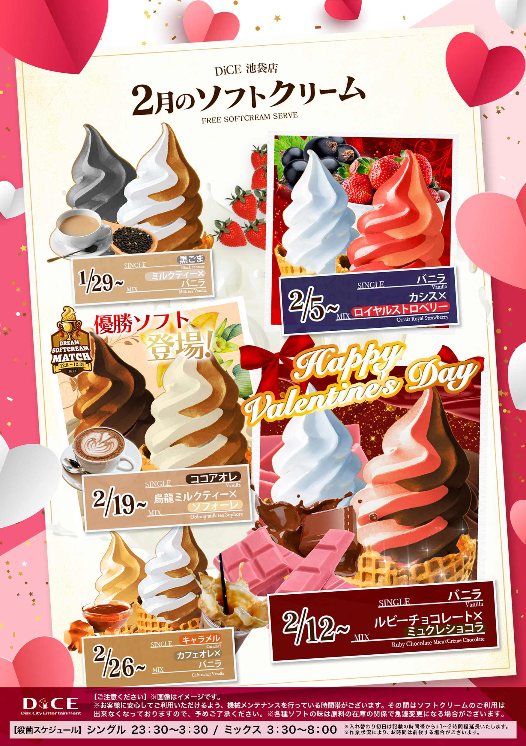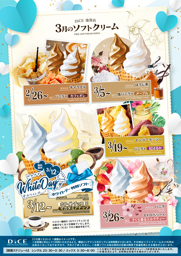 ソフトクリームスケジュール 各店のスケジュールはこちら 札幌駅南口店 札幌狸小路本店 仙台店 大宮店 赤羽店 池袋北口店 池袋西口店 新小岩店 渋谷ちとせ会館店 自由が丘店 大井町店 大森店 蒲田駅西口店 雑色店 川崎チネチッタ通店 川崎仲見世通店 溝口店 相模大野モアーズ店 伊勢佐木町店 戸塚店 横須賀中央三笠店 大阪道頓堀本店 大阪梅田東通店 ホワイトデー記念ソフト登場!季節感あふれるフレーバー続々! > 池袋店TOPに戻る 電話 ご予約はこちら ネットカフェダイス ネットカフェ&カラオケ DiCE 池袋店 ソフトクリームスケジュール