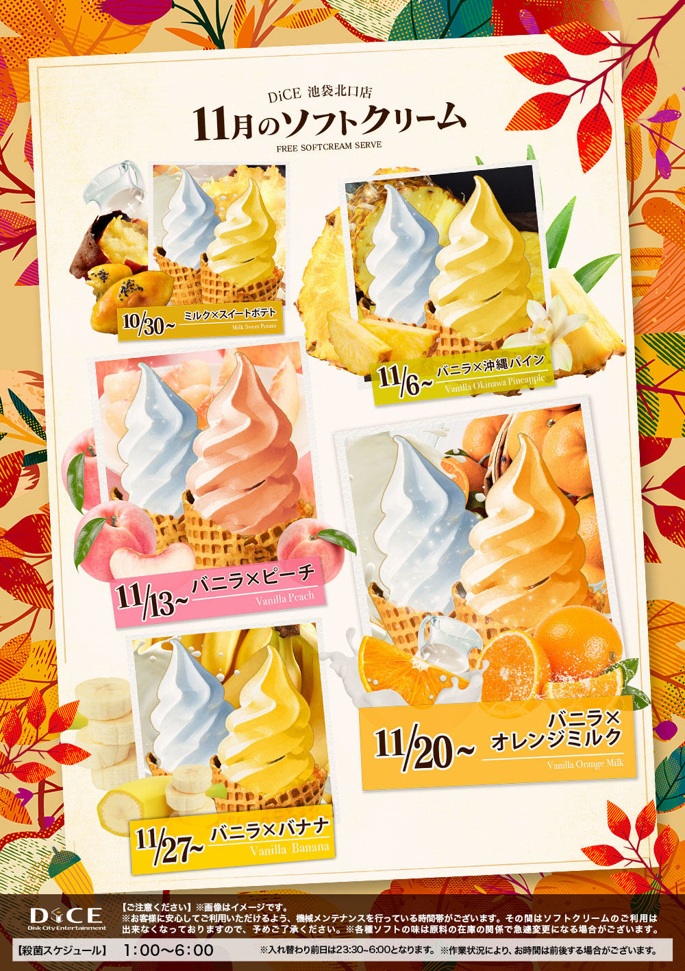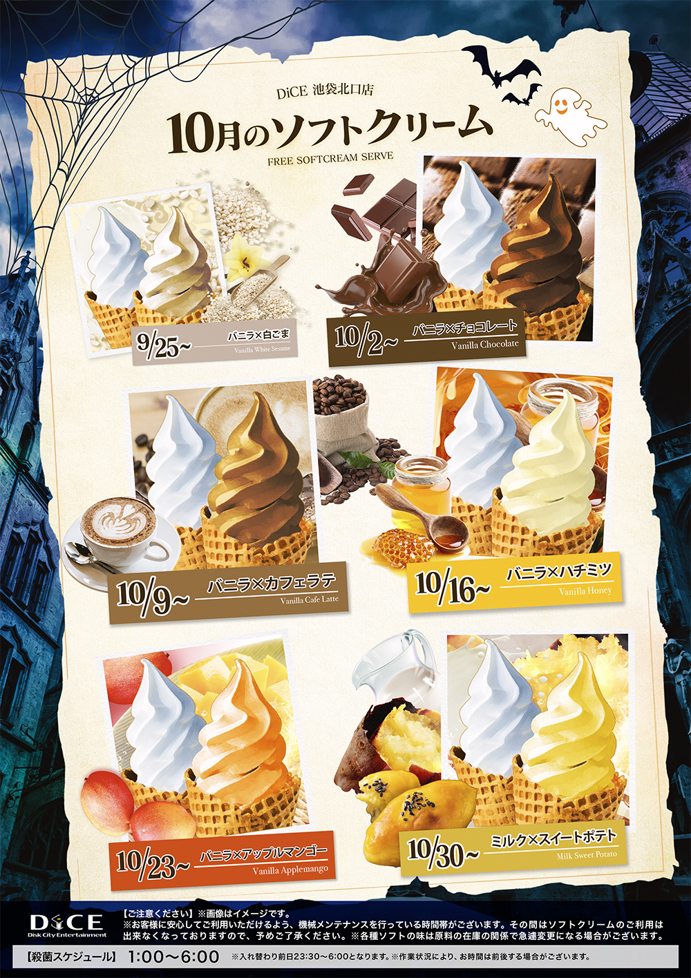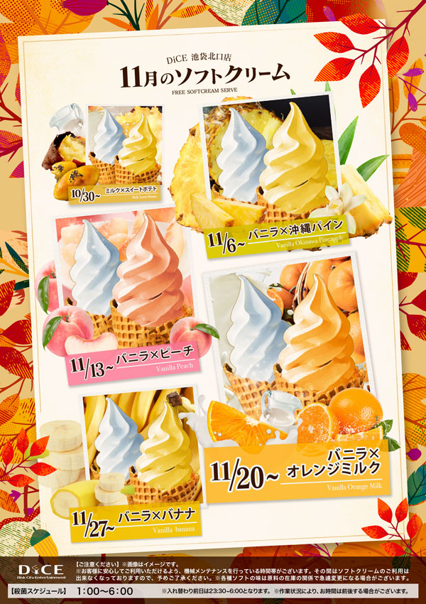 ソフトクリームスケジュール 各店のスケジュールはこちら 札幌駅南口店 札幌狸小路本店 仙台店 大宮店 赤羽店 池袋西口店 池袋店 新小岩店 渋谷ちとせ会館店 自由が丘店 大井町店 大森店 蒲田駅西口店 雑色店 川崎チネチッタ通店 川崎仲見世通店 溝口店 相模大野モアーズ店 伊勢佐木町店 戸塚店 横須賀中央三笠店 大阪道頓堀本店 大阪梅田東通店 12月ソフトクリーム予定表 > 池袋北口店TOPに戻る 電話 ご予約はこちら ネットカフェダイス ネットカフェ&カラオケ DiCE 池袋北口店 ソフトクリームスケジュール