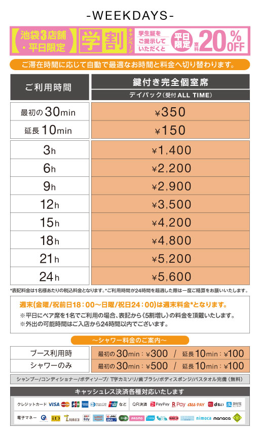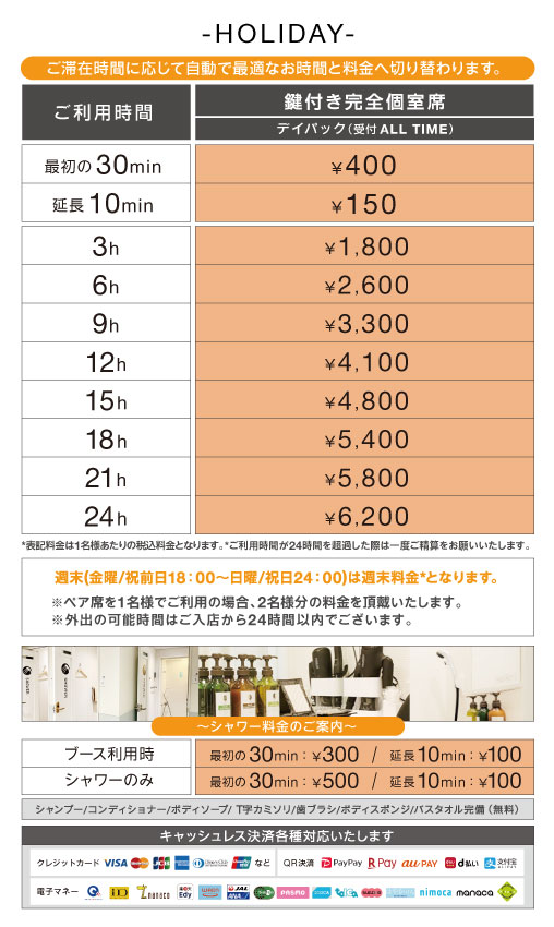 足を伸ばして横になれる広々フラットマット。ペアはもちろん、お一人様でも贅沢にご利用いただけます。レディース専用席をご用意しております。