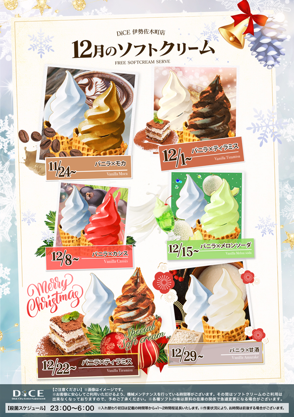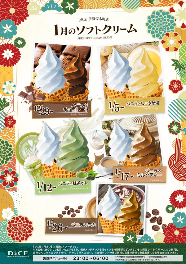 ソフトクリームスケジュール 各店のスケジュールはこちら 札幌駅南口店 札幌狸小路本店 仙台店 大宮店 赤羽店 池袋北口店 池袋西口店 池袋店 新小岩店 渋谷ちとせ会館店 自由が丘店 大井町店 大森店 蒲田駅西口店 雑色店 川崎チネチッタ通店 川崎仲見世通店 溝口店 相模大野モアーズ店 戸塚店 横須賀中央三笠店 大阪道頓堀本店 大阪梅田東通店 1月のソフトクリームスケジュールです > 伊勢佐木町店TOPに戻る 電話 ご予約はこちら ネットカフェダイス 完全個室ネットカフェ&ダーツ DiCE 伊勢佐木町店 ソフトクリームスケジュール