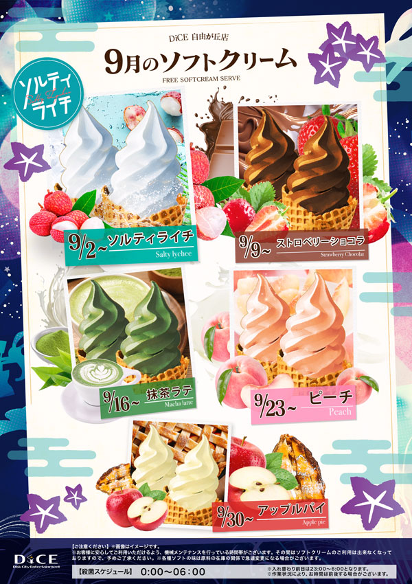 ソフトクリームスケジュール 各店のスケジュールはこちら 札幌駅南口店 札幌狸小路本店 仙台店 大宮店 赤羽店 池袋北口店 池袋西口店 池袋店 新小岩店 渋谷ちとせ会館店 大井町店 大森店 蒲田駅西口店 雑色店 川崎チネチッタ通店 川崎仲見世通店 溝口店 相模大野モアーズ店 伊勢佐木町店 戸塚店 横須賀中央三笠店 大阪道頓堀本店 大阪梅田東通店 10月のソフトクリーム予定表 > 自由が丘店TOPに戻る 電話 ご予約はこちら ネットカフェダイス ネットカフェ&カラオケ DiCE 自由が丘店 ソフトクリームスケジュール