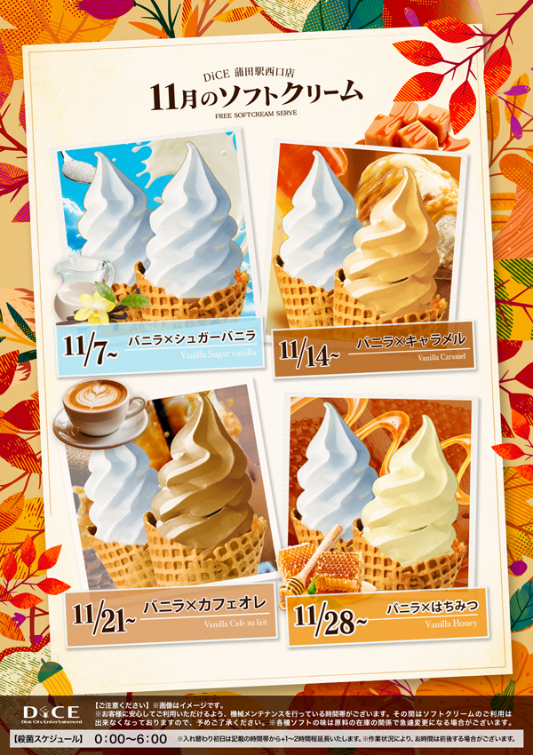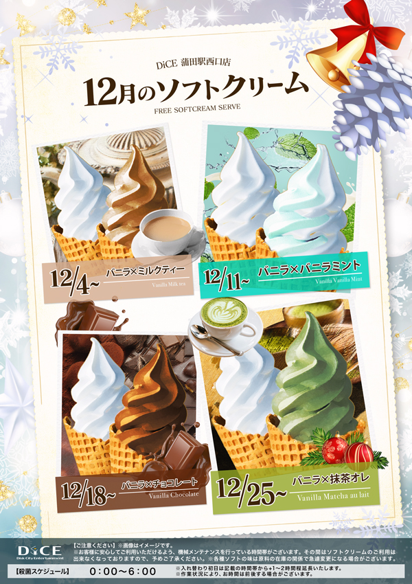 ソフトクリームスケジュール 各店のスケジュールはこちら 札幌駅南口店 札幌狸小路本店 仙台店 大宮店 赤羽店 池袋北口店 池袋西口店 池袋店 新小岩店 渋谷ちとせ会館店 自由が丘店 大井町店 大森店 雑色店 川崎チネチッタ通店 溝口店 相模大野モアーズ店 伊勢佐木町店 戸塚店 横須賀中央三笠店 大阪道頓堀本店 大阪梅田東通店 11月、12月のソフトクリームスケジュールはこちら♪ > 蒲田駅西口店TOPに戻る 電話 ご予約はこちら ネットカフェダイス ネットカフェ&ダーツ DiCE 蒲田駅西口店 ソフトクリームスケジュール