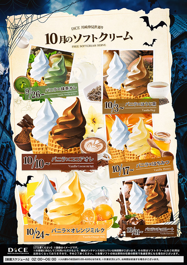 ソフトクリームスケジュール 各店のスケジュールはこちら 札幌駅南口店 札幌狸小路本店 仙台店 大宮店 赤羽店 池袋北口店 池袋西口店 池袋店 新小岩店 渋谷ちとせ会館店 自由が丘店 大井町店 大森店 蒲田駅西口店 雑色店 川崎チネチッタ通店 溝口店 相模大野モアーズ店 伊勢佐木町店 戸塚店 横須賀中央三笠店 大阪道頓堀本店 大阪梅田東通店 10月ソフトクリーム予定表 > 川崎仲見世通店TOPに戻る 電話 ご予約はこちら ネットカフェダイス ネットカフェ&ダーツ DiCE 川崎仲見世通店 ソフトクリームスケジュール