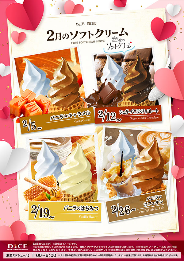 ソフトクリームスケジュール 各店のスケジュールはこちら 札幌駅南口店 札幌狸小路本店 仙台店 大宮店 赤羽店 池袋北口店 池袋西口店 池袋店 新小岩店 渋谷ちとせ会館店 自由が丘店 大井町店 大森店 蒲田駅西口店 雑色店 川崎チネチッタ通店 川崎仲見世通店 相模大野モアーズ店 伊勢佐木町店 戸塚店 横須賀中央三笠店 大阪道頓堀本店 大阪梅田東通店 2月ソフトクリーム予定表 > 溝口店TOPに戻る 電話 ご予約はこちら ネットカフェダイス インターネット&マンガ喫茶 DiCE 溝口店 ソフトクリームスケジュール