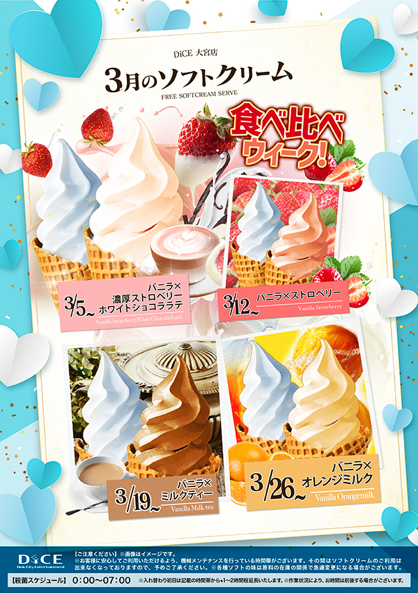 ソフトクリームスケジュール 各店のスケジュールはこちら 札幌駅南口店 札幌狸小路本店 仙台店 赤羽店 池袋北口店 池袋西口店 池袋店 新小岩店 渋谷ちとせ会館店 自由が丘店 大井町店 大森店 蒲田駅西口店 雑色店 川崎チネチッタ通店 川崎仲見世通店 溝口店 相模大野モアーズ店 伊勢佐木町店 戸塚店 横須賀中央三笠店 大阪道頓堀本店 大阪梅田東通店 26年4月度ソフトクリーム予定表 > 大宮店TOPに戻る 電話 ご予約はこちら ネットカフェダイス ネットカフェ&カラオケ DiCE 大宮店 ソフトクリームスケジュール