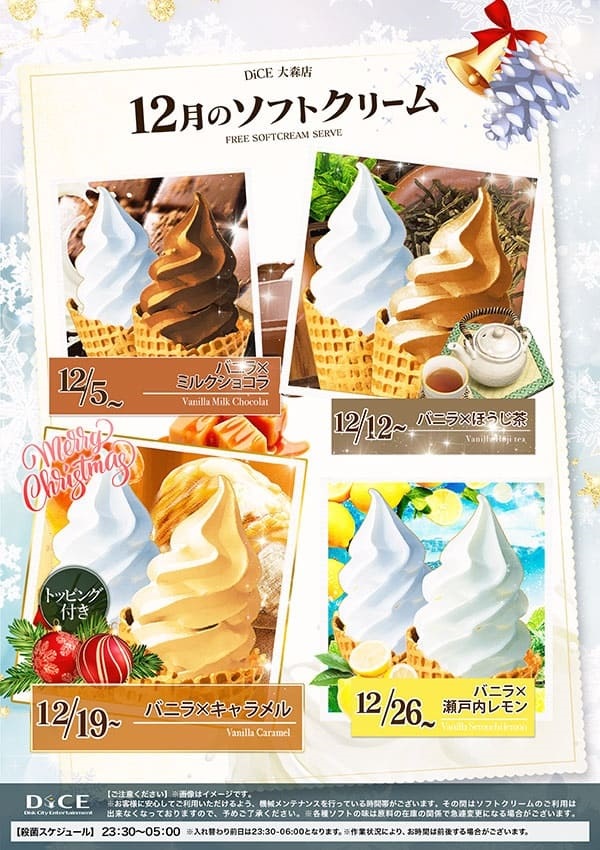 ソフトクリームスケジュール 各店のスケジュールはこちら 札幌駅南口店 札幌狸小路本店 仙台店 大宮店 赤羽店 池袋北口店 池袋西口店 池袋店 新小岩店 渋谷ちとせ会館店 自由が丘店 大井町店 蒲田駅西口店 雑色店 川崎チネチッタ通店 川崎仲見世通店 溝口店 相模大野モアーズ店 伊勢佐木町店 戸塚店 横須賀中央三笠店 大阪道頓堀本店 大阪梅田東通店 12月度ソフトクリーム予定表 > 大森店TOPに戻る 電話 ご予約はこちら ネットカフェダイス インターネット&マンガ喫茶 DiCE 大森店 ソフトクリームスケジュール