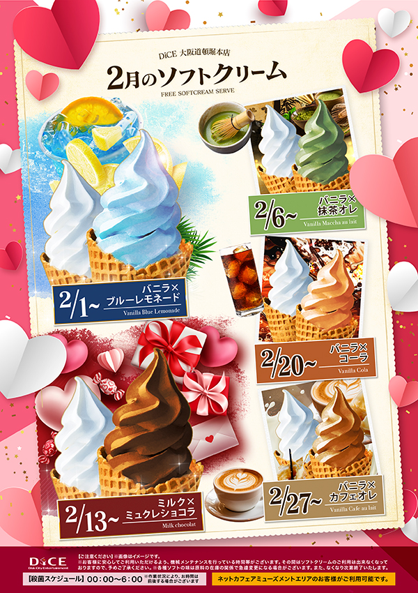 ソフトクリームスケジュール 各店のスケジュールはこちら 札幌駅南口店 仙台店 大宮店 赤羽店 池袋北口店 池袋西口店 池袋店 新小岩店 渋谷ちとせ会館店 自由が丘店 大井町店 大森店 蒲田駅西口店 雑色店 川崎チネチッタ通店 川崎仲見世通店 溝口店 相模大野モアーズ店 伊勢佐木町店 戸塚店 横須賀中央三笠店 大阪梅田東通店 2月のソフトクリーム予定表 >大阪道頓堀本店TOPに戻る 電話 ご予約はこちら ネットカフェダイス ネットカフェ&カラオケ DiCE 大阪道頓堀本店 ソフトクリームスケジュール