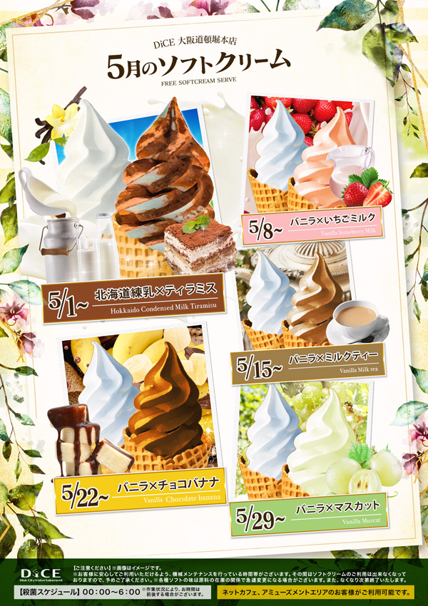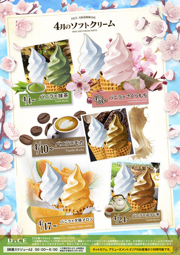 ソフトクリームスケジュール 各店のスケジュールはこちら 札幌駅南口店 仙台店 大宮店 赤羽店 池袋北口店 池袋西口店 池袋店 新小岩店 渋谷ちとせ会館店 自由が丘店 大井町店 大森店 蒲田駅西口店 雑色店 川崎チネチッタ通店 川崎仲見世通店 溝口店 相模大野モアーズ店 伊勢佐木町店 戸塚店 横須賀中央三笠店 大阪梅田東通店 5月のソフトクリーム予定表 >大阪道頓堀本店TOPに戻る 電話 ご予約はこちら ネットカフェダイス ネットカフェ&カラオケ DiCE 大阪道頓堀本店 ソフトクリームスケジュール