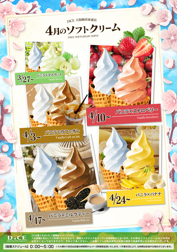 ソフトクリームスケジュール 各店のスケジュールはこちら 札幌駅南口店 札幌狸小路本店 仙台店 大宮店 赤羽店 池袋北口店 池袋西口店 池袋店 新小岩店 渋谷ちとせ会館店 自由が丘店 大井町店 大森店 蒲田駅西口店 雑色店 川崎仲見世通店 溝口店 相模大野モアーズ店 伊勢佐木町店 戸塚店 横須賀中央三笠店 大阪道頓堀本店 4月ソフトクリーム予定表 > 大阪梅田東通店TOPに戻る 電話 ご予約はこちら ネットカフェダイス 完全個室ネットカフェ DiCE 大阪梅田東通店 ソフトクリームスケジュール
