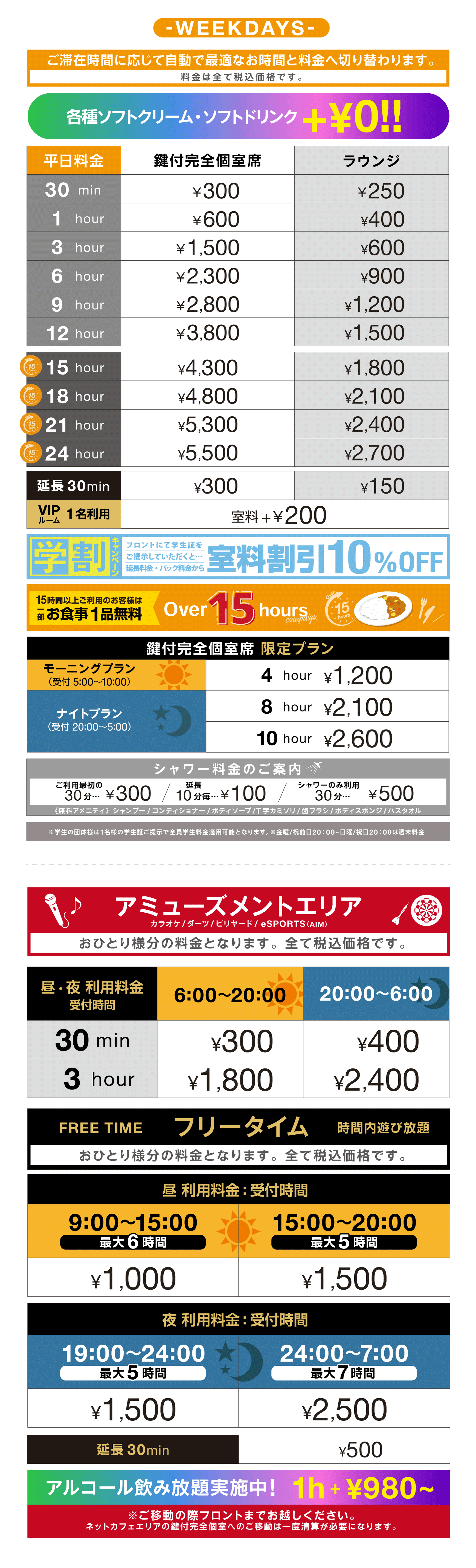 豊富な種類のドリンクや、シャワールーム、プリンターまで、