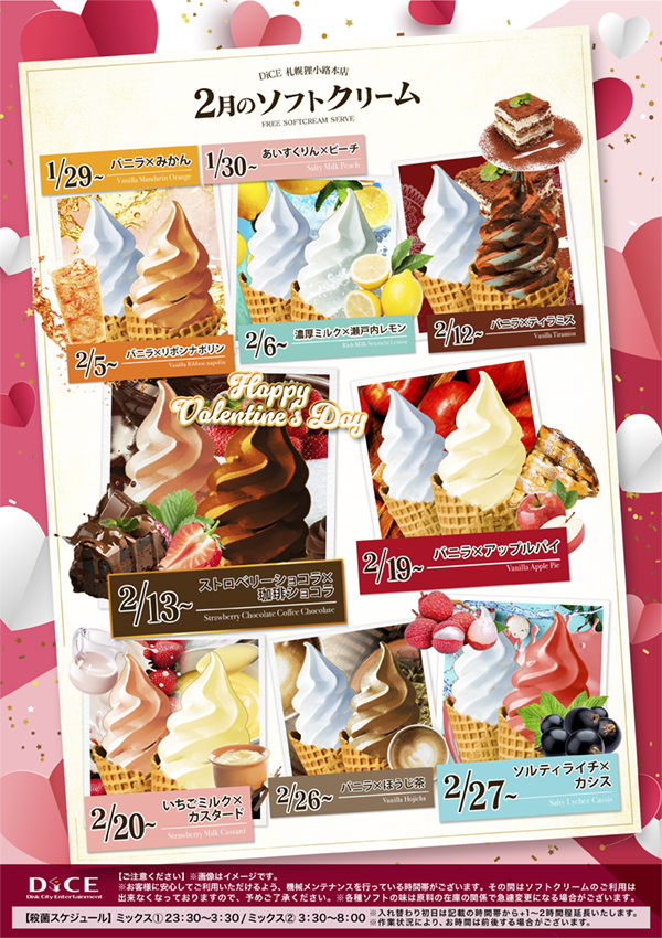 ソフトクリームスケジュール 各店のスケジュールはこちら 札幌駅南口店 仙台店 大宮店 赤羽店 池袋北口店 池袋西口店 池袋店 新小岩店 渋谷ちとせ会館店 自由が丘店 大井町店 大森店 蒲田駅西口店 雑色店 川崎チネチッタ通店 川崎仲見世通店 溝口店 相模大野モアーズ店 伊勢佐木町店 戸塚店 横須賀中央三笠店 大阪道頓堀本店 大阪梅田東通店 2月ソフトクリーム予定表 >札幌狸小路本店TOPに戻る 電話 ご予約はこちら ネットカフェダイス ネットカフェ&カラオケ DiCE 札幌狸小路本店 ソフトクリームスケジュール
