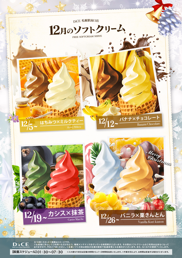 ソフトクリームスケジュール 各店のスケジュールはこちら 札幌狸小路本店 仙台店 大宮店 赤羽店 池袋北口店 池袋西口店 池袋店 新小岩店 渋谷ちとせ会館店 自由が丘店 大井町店 大森店 蒲田駅西口店 雑色店 川崎チネチッタ通店 川崎仲見世通店 溝口店 相模大野モアーズ店 伊勢佐木町店 戸塚店 横須賀中央三笠店 大阪道頓堀本店 大阪梅田東通店 12月度ソフトクリーム予定表 > 札幌駅南口店TOPに戻る 電話 ご予約はこちら ネットカフェダイス ネットカフェ&マンガ喫茶 DiCE 札幌駅南口店 ソフトクリームスケジュール