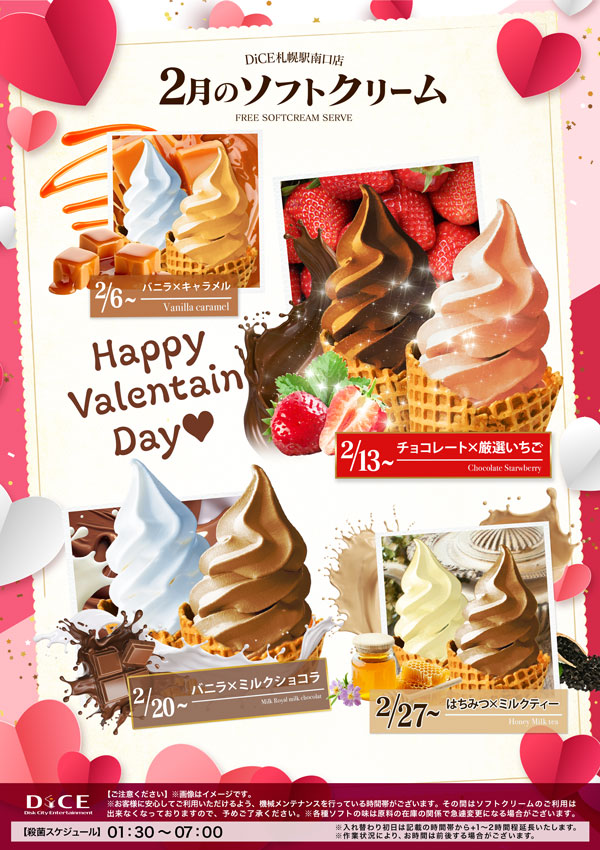 ソフトクリームスケジュール 各店のスケジュールはこちら 札幌狸小路本店 仙台店 大宮店 赤羽店 池袋北口店 池袋西口店 池袋店 新小岩店 渋谷ちとせ会館店 自由が丘店 大井町店 大森店 蒲田駅西口店 雑色店 川崎チネチッタ通店 川崎仲見世通店 溝口店 相模大野モアーズ店 伊勢佐木町店 戸塚店 横須賀中央三笠店 大阪道頓堀本店 大阪梅田東通店 2月度ソフトクリーム予定表 > 札幌駅南口店TOPに戻る 電話 ご予約はこちら ネットカフェダイス ネットカフェ&マンガ喫茶 DiCE 札幌駅南口店 ソフトクリームスケジュール