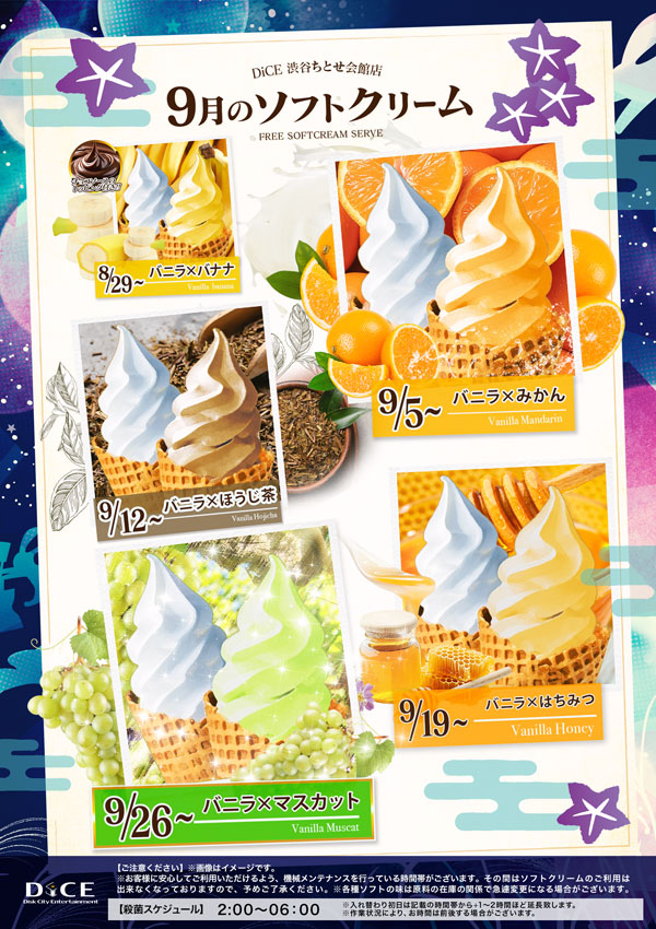 ソフトクリームスケジュール 各店のスケジュールはこちら 札幌駅南口店 札幌狸小路本店 仙台店 大宮店 赤羽店 池袋北口店 池袋西口店 池袋店 新小岩店 自由が丘店 大井町店 大森店 蒲田駅西口店 雑色店 川崎チネチッタ通店 川崎仲見世通店 溝口店 相模大野モアーズ店 伊勢佐木町店 戸塚店 横須賀中央三笠店 大阪道頓堀本店 大阪梅田東通店 9.10月のソフトクリーム予定表???? > 渋谷ちとせ会館店TOPに戻る 電話 ご予約はこちら ネットカフェダイス 完全個室ネットカフェ DiCE 渋谷ちとせ会館店 ソフトクリームスケジュール