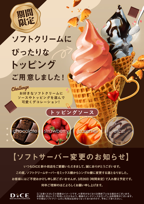 ソフトクリームスケジュール 各店のスケジュールはこちら 札幌駅南口店 札幌狸小路本店 仙台店 大宮店 赤羽店 池袋北口店 池袋西口店 池袋店 渋谷ちとせ会館店 自由が丘店 大井町店 大森店 蒲田駅西口店 雑色店 川崎チネチッタ通店 川崎仲見世通店 溝口店 相模大野モアーズ店 伊勢佐木町店 戸塚店 横須賀中央三笠店 大阪道頓堀本店 大阪梅田東通店 トッピングソース導入 > 新小岩店TOPに戻る 電話 ご予約はこちら ネットカフェダイス インターネット&マンガ喫茶 DiCE 新小岩店 ソフトクリームスケジュール