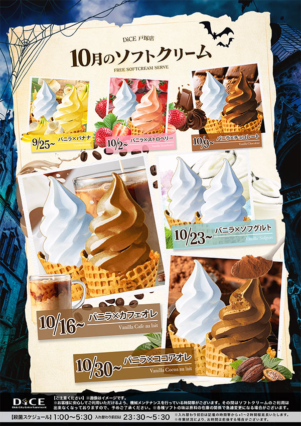 ソフトクリームスケジュール 各店のスケジュールはこちら 札幌駅南口店 札幌狸小路本店 仙台店 大宮店 赤羽店 池袋北口店 池袋西口店 池袋店 新小岩店 渋谷ちとせ会館店 自由が丘店 大井町店 大森店 蒲田駅西口店 雑色店 川崎チネチッタ通店 川崎仲見世通店 溝口店 相模大野モアーズ店 伊勢佐木町店 横須賀中央三笠店 大阪道頓堀本店 大阪梅田東通店 10月ソフトクリーム予定表 > 戸塚店TOPに戻る 電話 ご予約はこちら ネットカフェダイス インターネット&マンガ喫茶 DiCE 戸塚店 ソフトクリームスケジュール