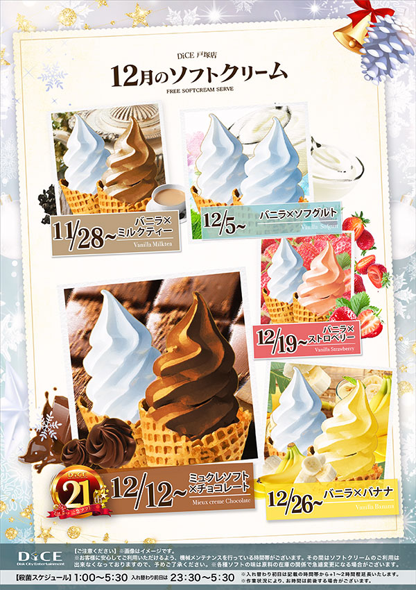 ソフトクリームスケジュール 各店のスケジュールはこちら 札幌駅南口店 札幌狸小路本店 仙台店 大宮店 赤羽店 池袋北口店 池袋西口店 池袋店 新小岩店 渋谷ちとせ会館店 自由が丘店 大井町店 大森店 蒲田駅西口店 雑色店 川崎チネチッタ通店 川崎仲見世通店 溝口店 相模大野モアーズ店 伊勢佐木町店 横須賀中央三笠店 大阪道頓堀本店 大阪梅田東通店 12月・1月ソフトクリーム予定表 > 戸塚店TOPに戻る 電話 ご予約はこちら ネットカフェダイス インターネット&マンガ喫茶 DiCE 戸塚店 ソフトクリームスケジュール