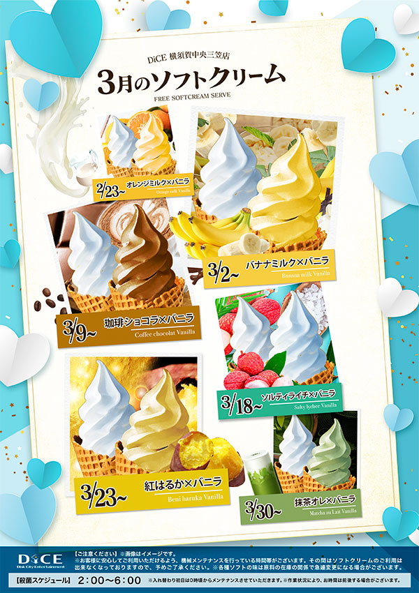 ソフトクリームスケジュール 各店のスケジュールはこちら 札幌駅南口店 札幌狸小路本店 仙台店 大宮店 赤羽店 池袋北口店 池袋西口店 池袋店 新小岩店 渋谷ちとせ会館店 自由が丘店 大井町店 大森店 蒲田駅西口店 雑色店 川崎チネチッタ通店 川崎仲見世通店 溝口店 相模大野モアーズ店 伊勢佐木町店 戸塚店 大阪道頓堀本店 大阪梅田東通店 3月のソフトクリームスケジュールはこちら♪※一部修正がございます。 > 横須賀中央三笠店TOPに戻る 電話 ご予約はこちら ネットカフェダイス インターネット&マンガ喫茶 DiCE 横須賀中央三笠店 ソフトクリームスケジュール