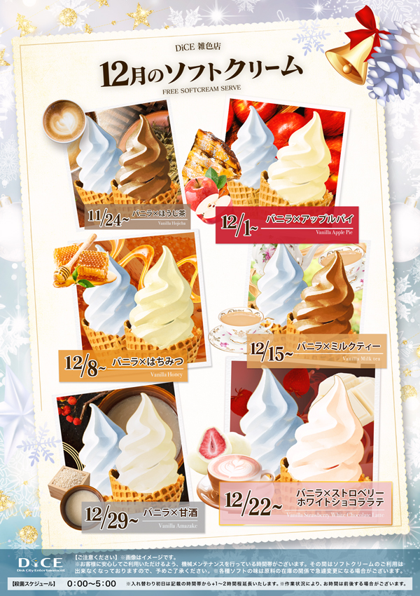 ソフトクリームスケジュール 各店のスケジュールはこちら 札幌駅南口店 札幌狸小路本店 仙台店 大宮店 赤羽店 池袋北口店 池袋西口店 池袋店 新小岩店 渋谷ちとせ会館店 自由が丘店 大井町店 大森店 蒲田駅西口店 川崎チネチッタ通店 川崎仲見世通店 溝口店 相模大野モアーズ店 伊勢佐木町店 戸塚店 横須賀中央三笠店 大阪道頓堀本店 大阪梅田東通店 12月ソフトクリーム予定表 > 雑色店TOPに戻る 電話 ご予約はこちら ネットカフェダイス ネットカフェ&マンガ喫茶 DiCE 雑色店 ソフトクリームスケジュール