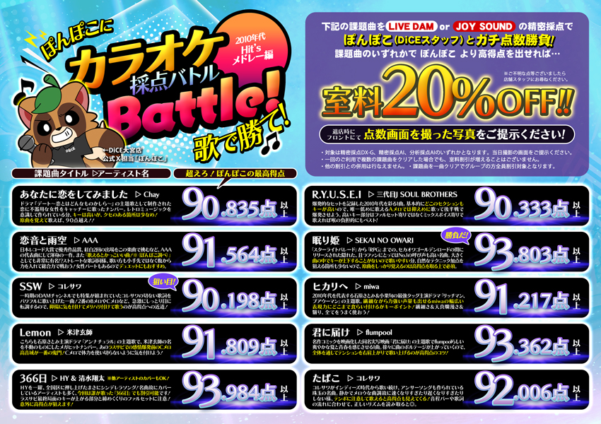 ニュース キャンペーン 2026.02.01 DiCEカラオケ設置店舗全店で【ぽんぽこ採点バトル】を実施中! ※池袋北口店は40%OFF、自由が丘店は10%OFF、それ以外の店舗は20%OFFとなります。※自由が丘店は他の割引と併用可能、その他の店舗は併用割引は不可となります。 > ニュース一覧に戻る