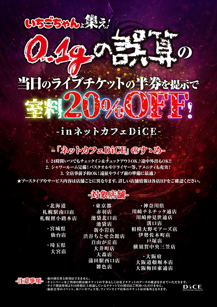ニュース キャンペーン 2026.01.23 『0.1gの誤算』ライブチケット半券割引再開! > ニュース一覧に戻る 電話 ご予約はこちら ネットカフェダイス インターネット&マンガ喫茶 DiCE 赤羽店 ニュース 『0.1gの誤算』ライブチケット半券割引再開!
