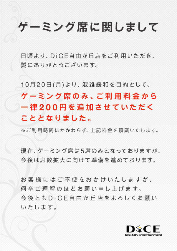 ニュース お知らせ 2025.10.18 ゲーミング席の追加料金について > ニュース一覧に戻る 電話 ご予約はこちら ネットカフェダイス ネットカフェ&カラオケ DiCE 自由が丘店 ニュース ゲーミング席の追加料金について