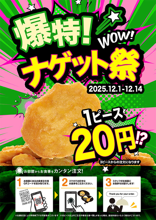 ニュース キャンペーン 2025.11.29 爆特!ナゲット祭、開催! > ニュース一覧に戻る 電話 ご予約はこちら ネットカフェダイス ネットカフェ&カラオケ DiCE 自由が丘店 ニュース 爆特!ナゲット祭、開催!
