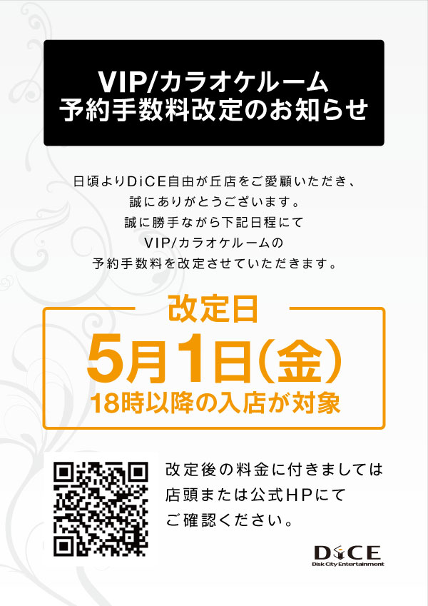 ニュース お知らせ 2026.04.17 予約手数料改定のお知らせ > ニュース一覧に戻る 電話 ご予約はこちら ネットカフェダイス ネットカフェ&カラオケ DiCE 自由が丘店 ニュース 予約手数料改定のお知らせ