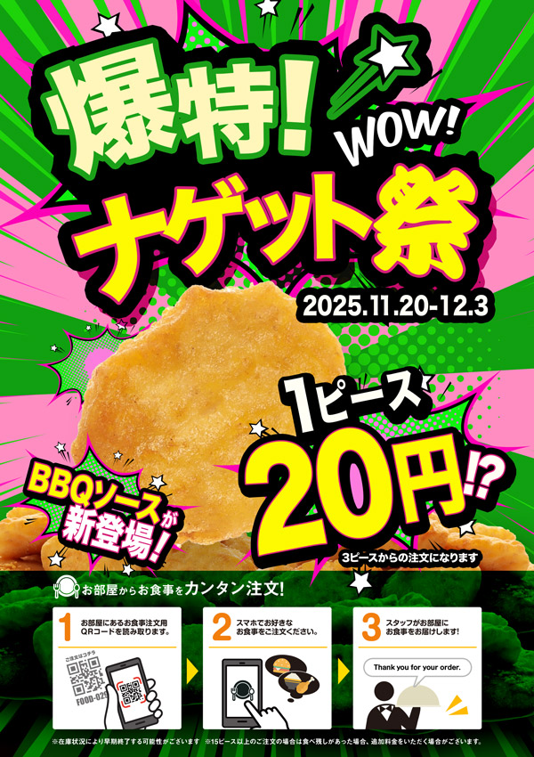 ニュース キャンペーン 2025.11.19 【1ピース¥20-!】ナゲット祭、再開催! > ニュース一覧に戻る 電話 ご予約はこちら ネットカフェダイス インターネット&マンガ喫茶 DiCE 大宮店 ニュース 【1ピース¥20-!】ナゲット祭、再開催!