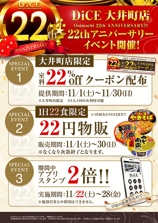 ニュース キャンペーン 2025.11.01 DiCE大井町店22周年キャンペーン > ニュース一覧に戻る 電話 ご予約はこちら ネットカフェダイス インターネット&マンガ喫茶 DiCE 大井町店 ニュース DiCE大井町店22周年キャンペーン