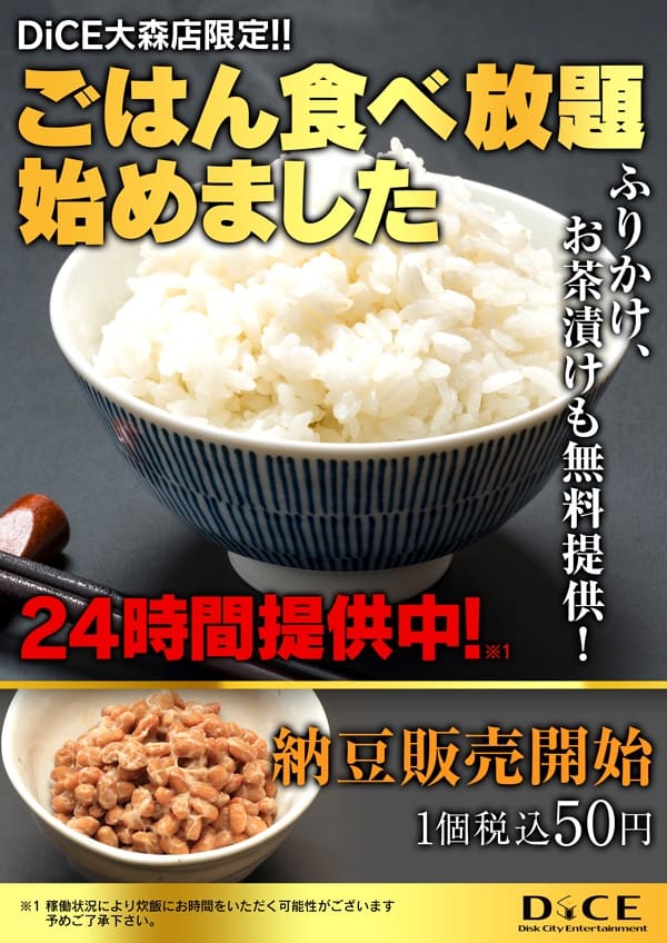 ニュース お知らせ 2025.12.05 ご飯食べ放題始めました!! > ニュース一覧に戻る 電話 ご予約はこちら ネットカフェダイス インターネット&マンガ喫茶 DiCE 大森店 ニュース ご飯食べ放題始めました!!