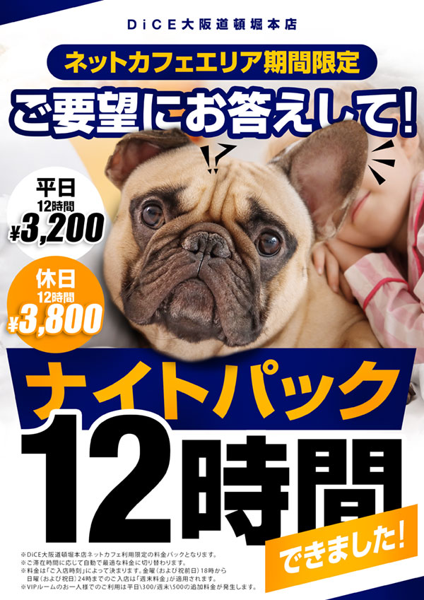 ニュース お知らせ 2026.04.01 ナイトパック12時間\3,200~ > ニュース一覧に戻る 電話 ご予約はこちら ネットカフェダイス ネットカフェ&カラオケ DiCE 大阪道頓堀本店 ニュース ナイトパック12時間\3,200~