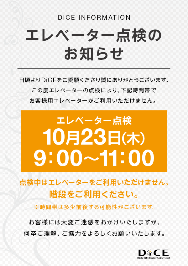 ニュース お知らせ 2025.10.13 エレベーター点検のお知らせ > ニュース一覧に戻る 電話 ご予約はこちら ネットカフェダイス 完全個室ネットカフェ DiCE 大阪梅田東通店 ニュース エレベーター点検のお知らせ