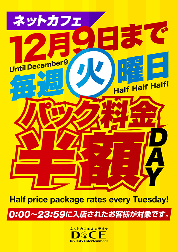 ニュース お知らせ 2025.11.12 ネットカフェ 火曜日半額DAY! > ニュース一覧に戻る 電話 ご予約はこちら ネットカフェダイス 完全個室ネットカフェ DiCE 大阪梅田東通店 ニュース ネットカフェ 火曜日半額DAY!