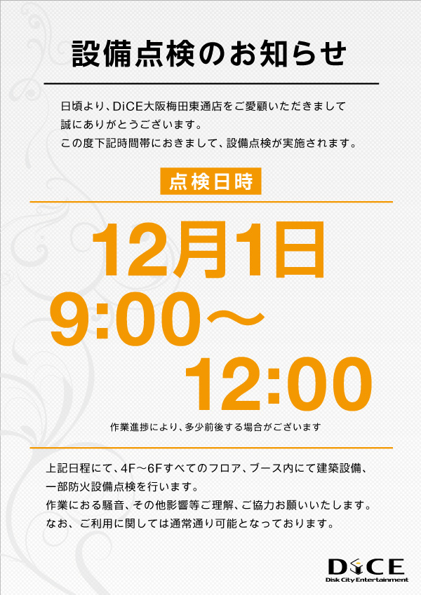 ニュース お知らせ 2025.11.24 12月1日 設備点検のお知らせ > ニュース一覧に戻る 電話 ご予約はこちら ネットカフェダイス 完全個室ネットカフェ DiCE 大阪梅田東通店 ニュース 12月1日 設備点検のお知らせ