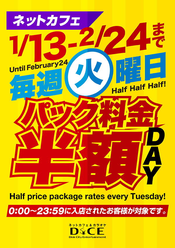 ニュース キャンペーン 2026.01.07 火曜パック料金半額キャンペーン!!【1/13~2/24まで】 > ニュース一覧に戻る 電話 ご予約はこちら ネットカフェダイス 完全個室ネットカフェ DiCE 大阪梅田東通店 ニュース 火曜パック料金半額キャンペーン!!【1/13~2/24まで】