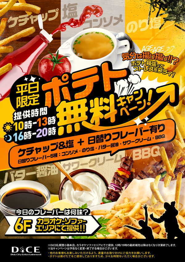 【朝も!夜も!】ポテトを無料提供‼【カラオケエリア】