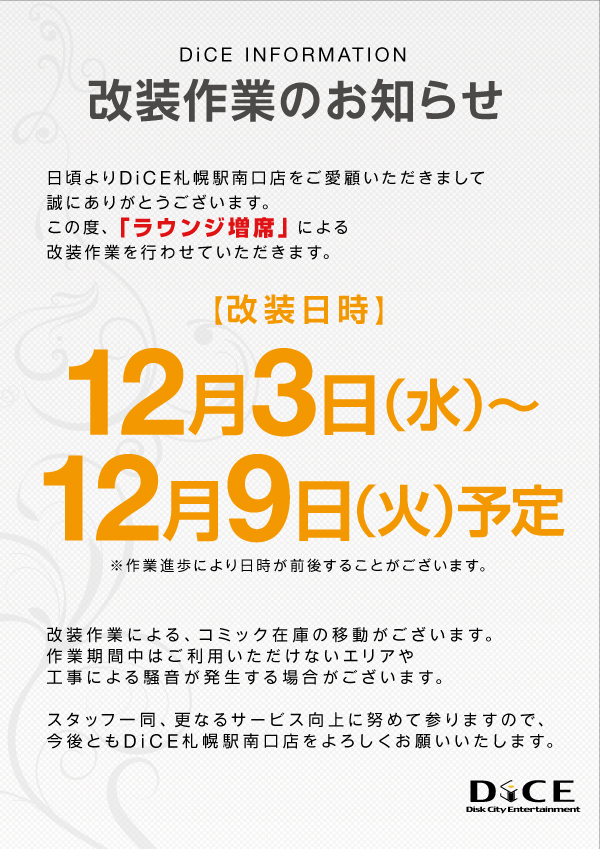 ニュース お知らせ 2025.12.01 改装作業のお知らせ > ニュース一覧に戻る 電話 ご予約はこちら ネットカフェダイス インターネット&マンガ喫茶 DiCE 札幌駅南口店 ニュース 改装作業のお知らせ