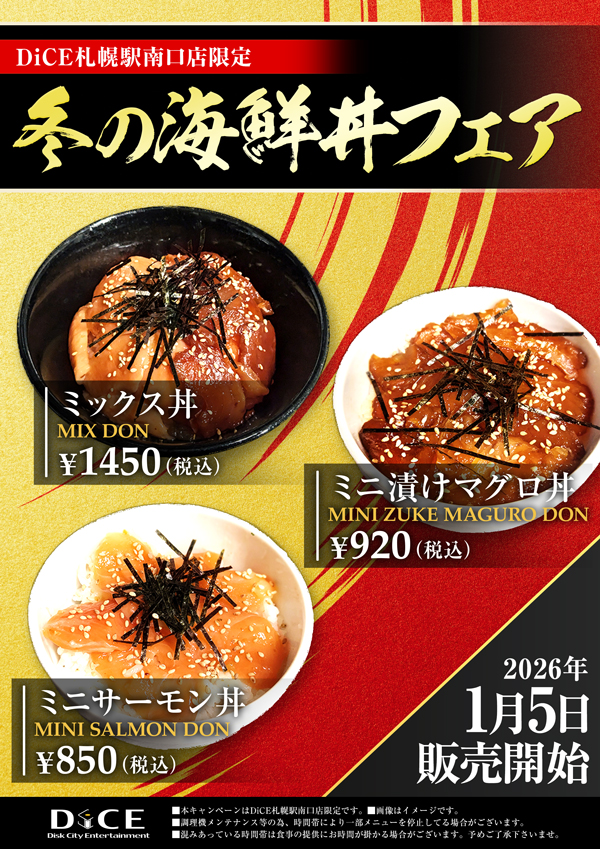 ニュース キャンペーン 2025.12.29 DiCE札幌駅南口店限定 冬の海鮮丼フェア DiCE札幌駅南口店限定!サーモン丼に漬けマグロ丼が期間限定で登場2026年1月5日スタート > ニュース一覧に戻る 電話 ご予約はこちら ネットカフェダイス インターネット&マンガ喫茶 DiCE 札幌駅南口店 ニュース DiCE札幌駅南口店限定 冬の海鮮丼フェア
