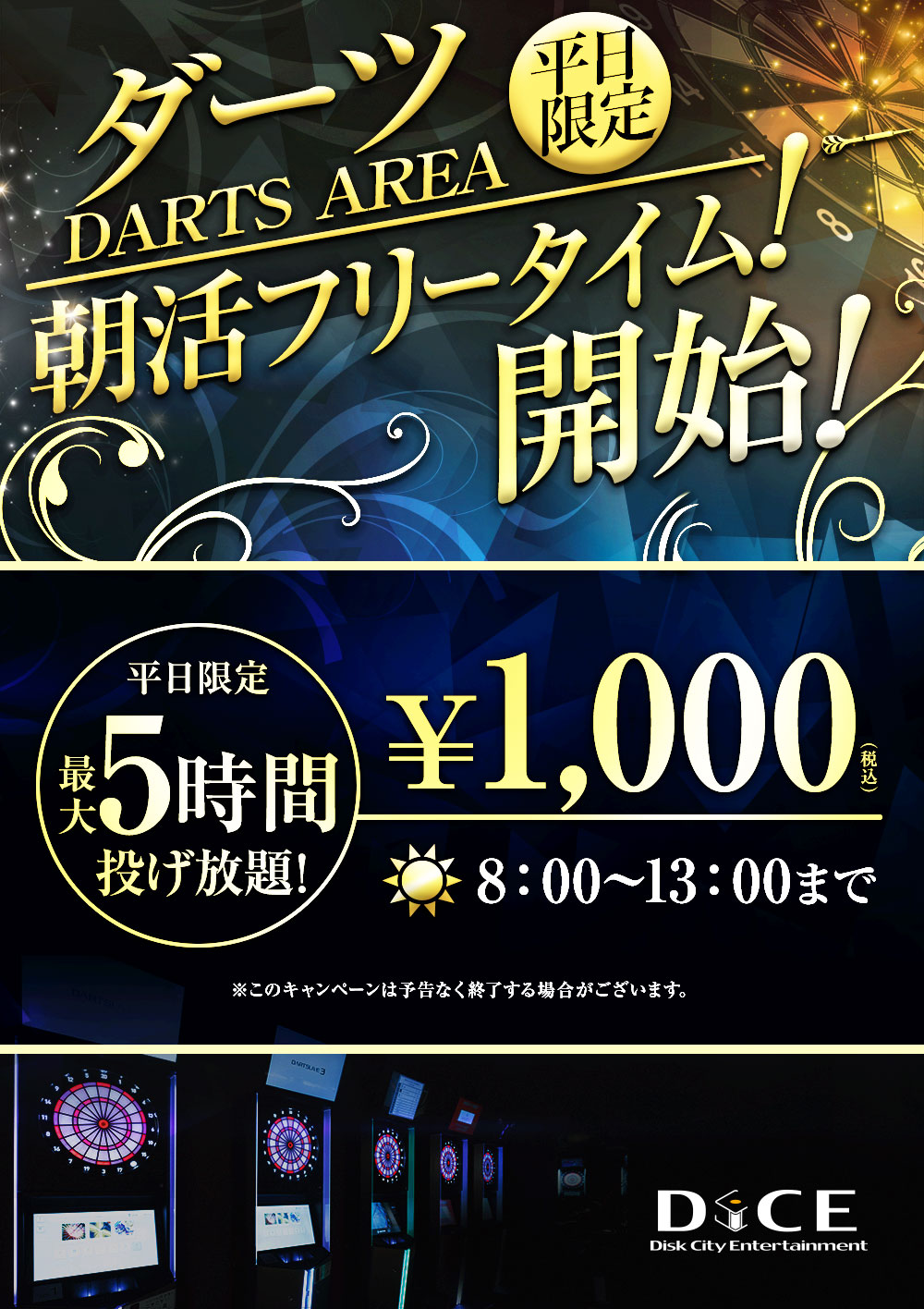 ニュース キャンペーン 2026.01.08 【平日限定】ダーツ朝活フリータイム開始!! > ニュース一覧に戻る 電話 ご予約はこちら ネットカフェダイス ネットカフェ&カラオケ DiCE 仙台店 ニュース 【平日限定】ダーツ朝活フリータイム開始!!