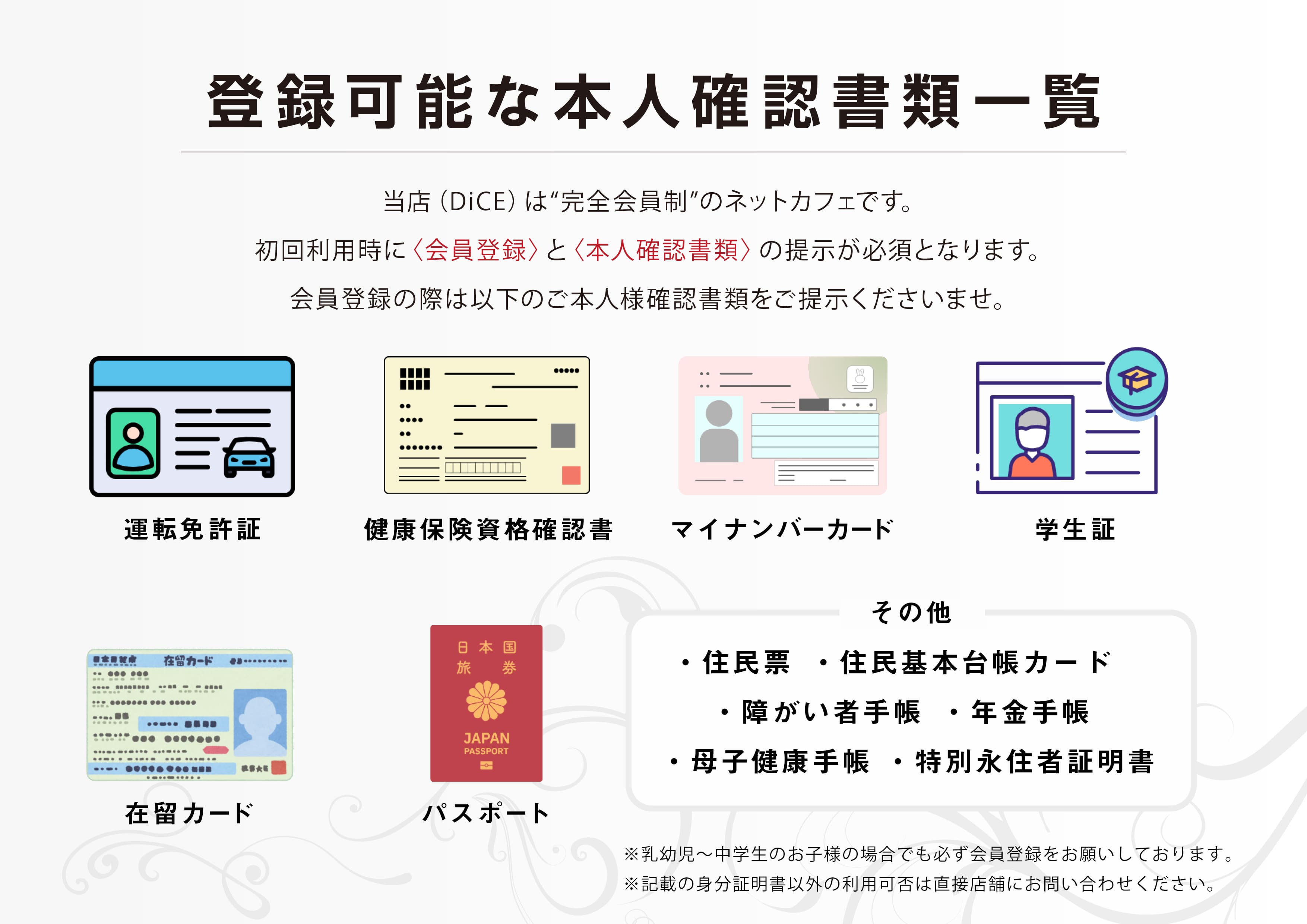 利用をご希望の場合は氏名/生年月日/現住所記載の本人確認書類をご持参ください。