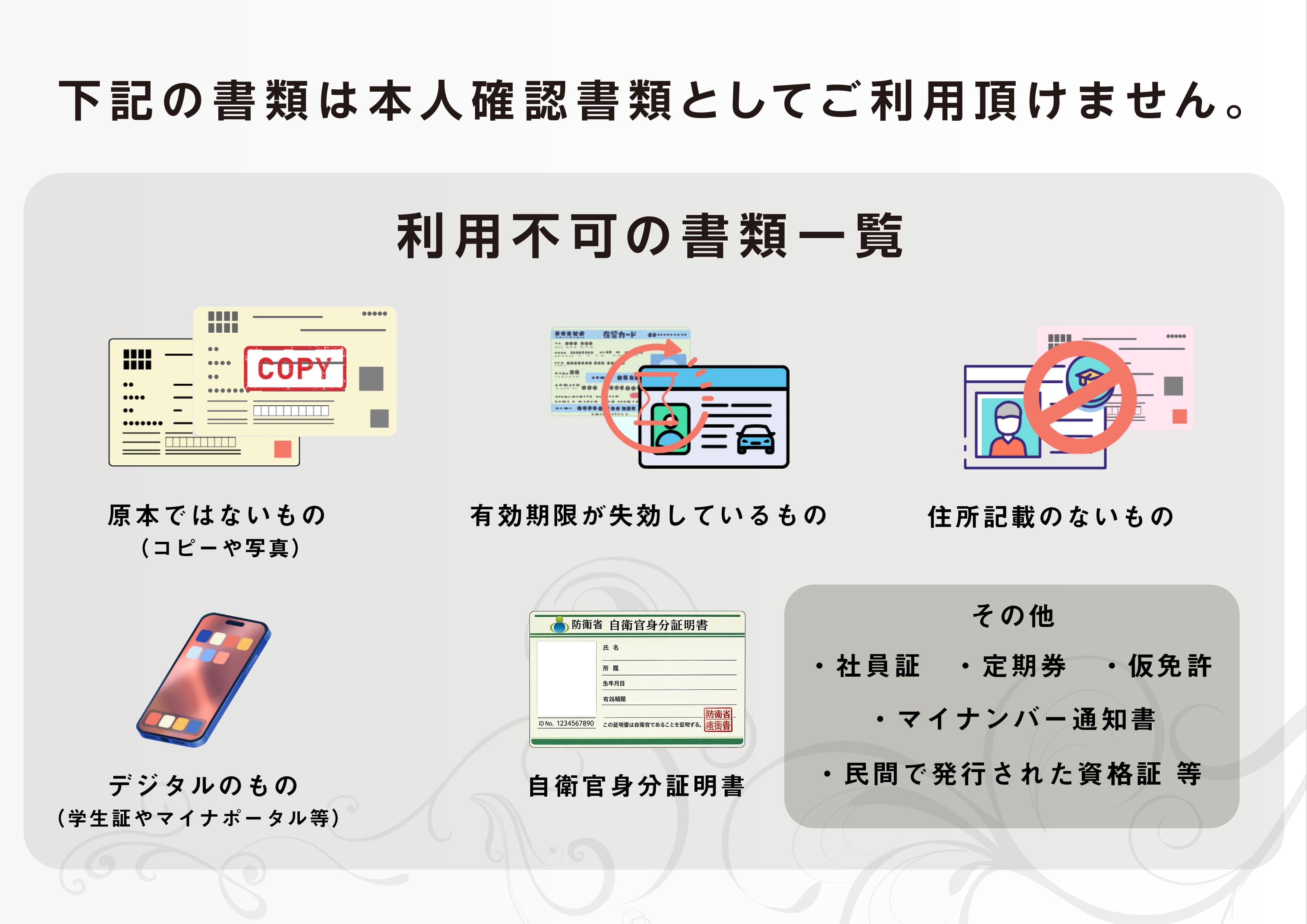 ※氏名・生年月日・現住所の記載がない本人確認書類はご利用いただけません。