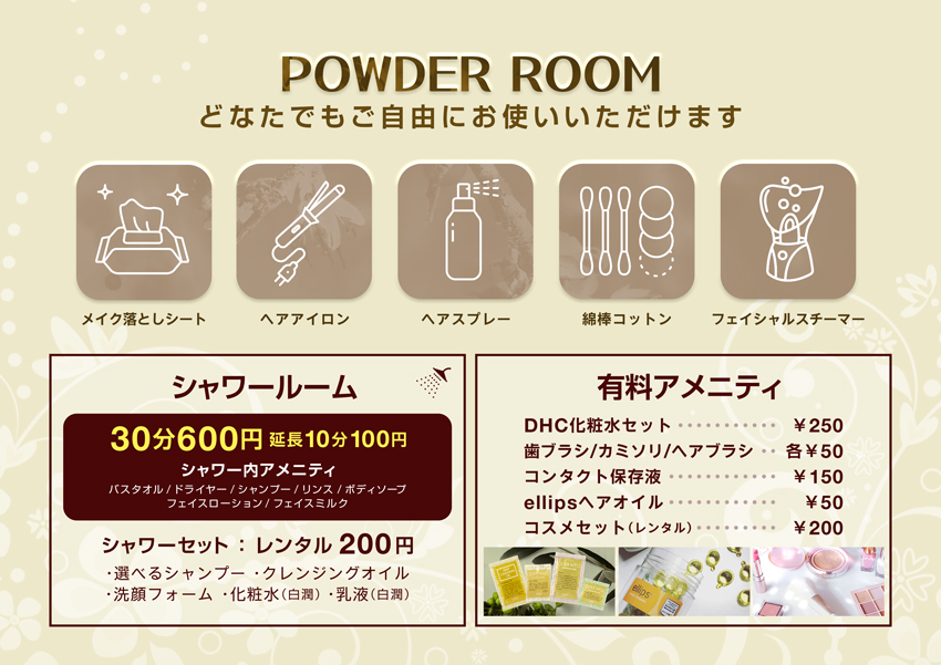 パウダールームのみの利用も1h¥400~で利用可能です!