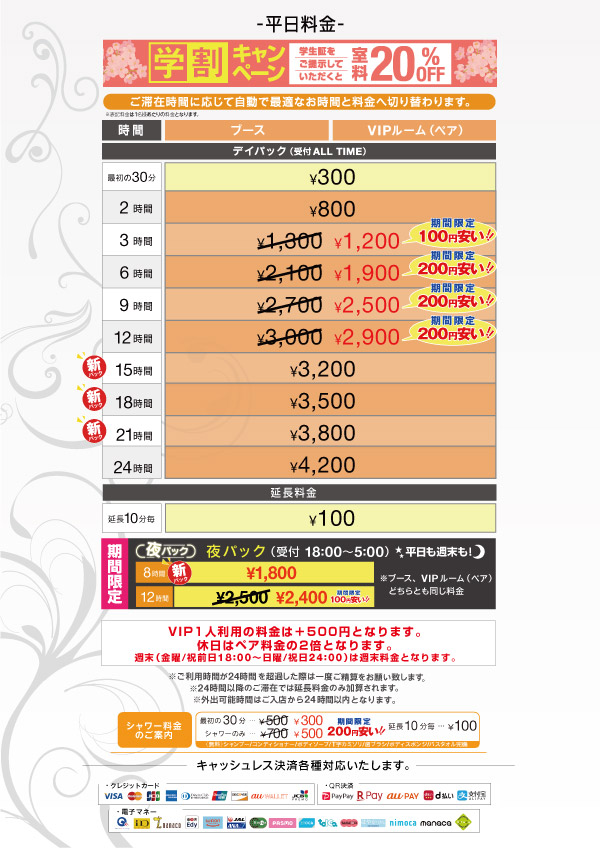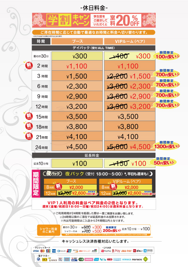 ニュース お知らせ 2026.01.24 料金改定のご案内 2/2から新たな料金パックも増えてリニューアルします! > ニュース一覧に戻る 電話 ご予約はこちら ネットカフェダイス インターネット&マンガ喫茶 DiCE 新小岩店 ニュース 料金改定のご案内