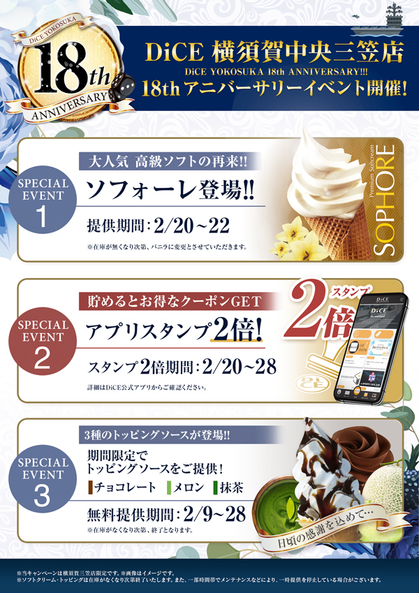 ニュース お知らせ 2026.02.09 OPEN18周年アニバーサリーイベント開催!! > ニュース一覧に戻る 電話 ご予約はこちら ネットカフェダイス インターネット&マンガ喫茶 DiCE 横須賀中央三笠店 ニュース OPEN18周年アニバーサリーイベント開催!!