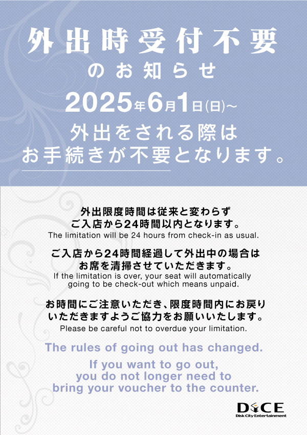 ニュース お知らせ 2025.06.01 一時外出システム変更のお知らせ > ニュース一覧に戻る 電話 ご予約はこちら ネットカフェダイス インターネット&マンガ喫茶 DiCE 雑色店 ニュース 一時外出システム変更のお知らせ