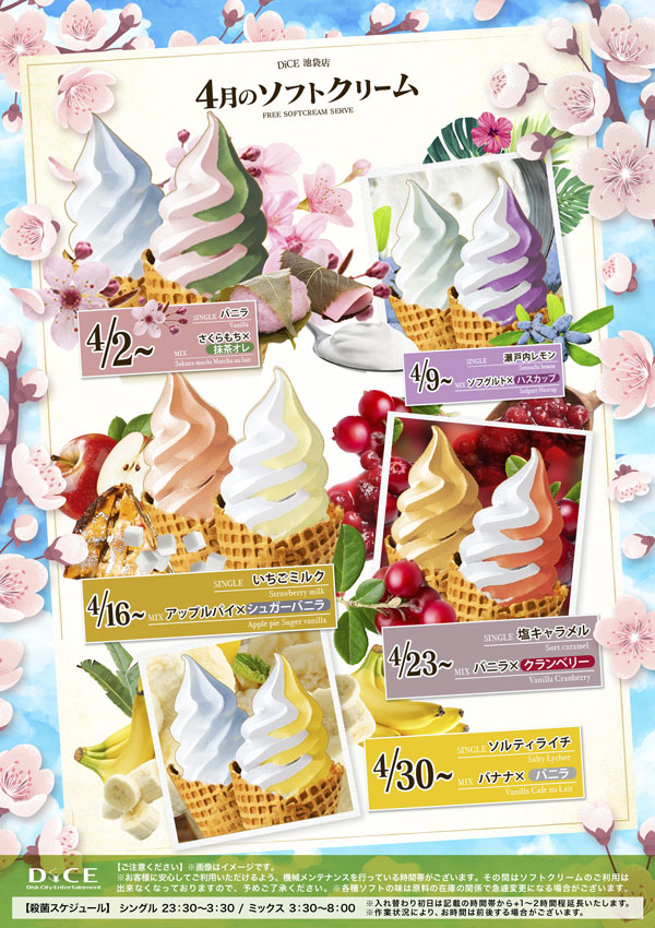 ソフトクリームスケジュール 各店のスケジュールはこちら 札幌駅南口店 札幌狸小路本店 仙台店 大宮店 赤羽店 池袋北口店 池袋西口店 新小岩店 渋谷ちとせ会館店 自由が丘店 大井町店 大森店 蒲田駅西口店 雑色店 川崎チネチッタ通店 川崎仲見世通店 溝口店 相模大野モアーズ店 伊勢佐木町店 戸塚店 横須賀中央三笠店 大阪道頓堀本店 大阪梅田東通店 春を感じるさくらもち味登場!フルーティーなフレーバーも続々! > 池袋店TOPに戻る 電話 ご予約はこちら ネットカフェダイス ネットカフェ&カラオケ DiCE 池袋店 ソフトクリームスケジュール