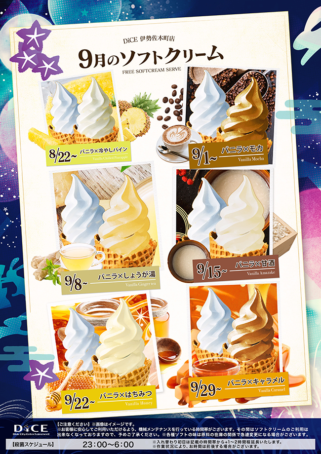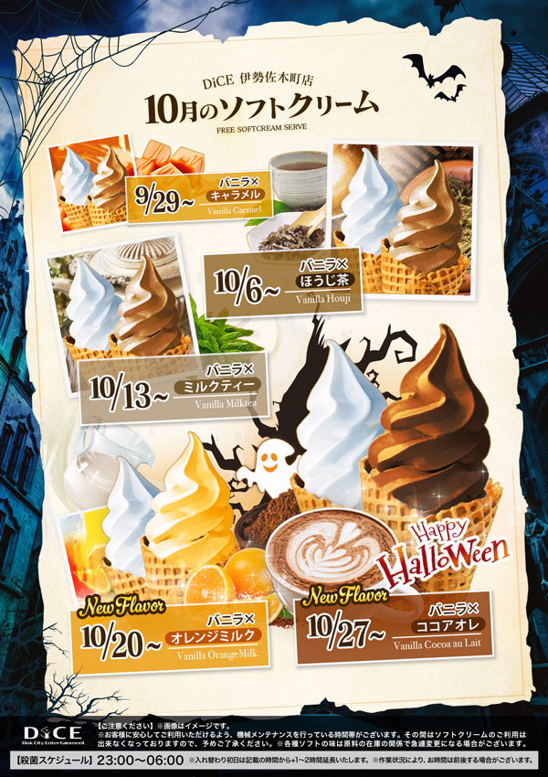 ソフトクリームスケジュール 各店のスケジュールはこちら 札幌駅南口店 札幌狸小路本店 仙台店 大宮店 赤羽店 池袋北口店 池袋西口店 池袋店 新小岩店 渋谷ちとせ会館店 自由が丘店 大井町店 大森店 蒲田駅西口店 雑色店 川崎チネチッタ通店 川崎仲見世通店 溝口店 相模大野モアーズ店 戸塚店 横須賀中央三笠店 大阪道頓堀本店 大阪梅田東通店 10月のソフトクリームスケジュールです > 伊勢佐木町店TOPに戻る 電話 ご予約はこちら ネットカフェダイス ネットカフェ&ダーツ DiCE 伊勢佐木町店 ソフトクリームスケジュール